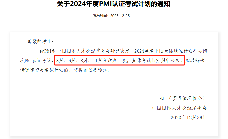 目前,PMI协会和人才交流基金会已经确定了2024年PMI认证考试的时间,计划3月、6月、8月、11月各举办一次PMI认证考试,详情请看以下文件: