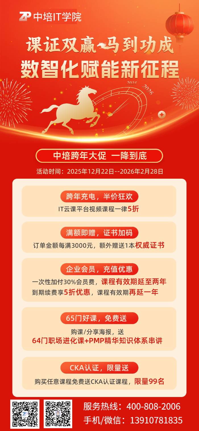 2025年即将圆满收官,衷心感谢各位企业与学员对中培IT学院的长期信任与支持。2026年,我们将继续秉持专业、务实的态度,为大家提供更优质的课程与服务。辞旧迎新之际,中培IT学院特别推出“课证双赢,跨年大促”超值活动,助力每一位IT人开启新征程!